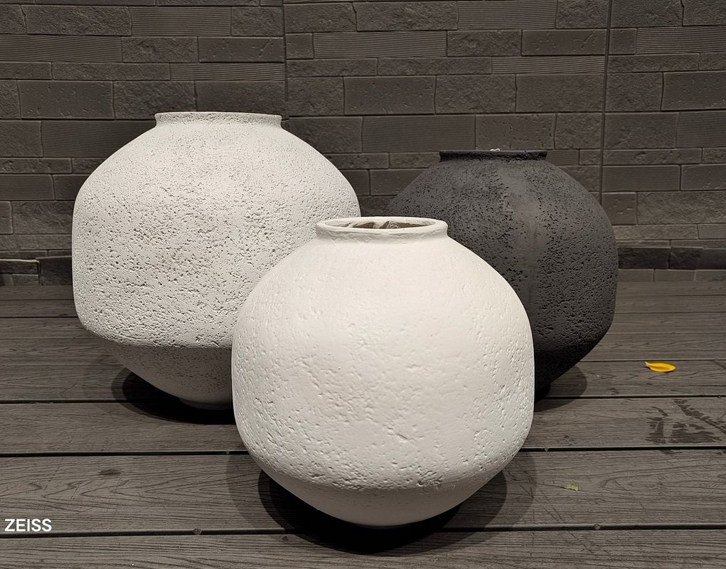 Κατασκευασμένα από ένα μείγμα πηλού και ινών, αυτά τα φυτευτήρια παρουσιάζουν μια μοναδική υφή στην επιφάνεια, προσθέτοντας στην οπτική τους γοητεία. Το χειροποίητο σκαλιστό φινίρισμα ενισχύει περαιτέρω τη μοντέρνα τους εμφάνιση, κάνοντάς τα να ξεχωρίζουν ως κομψά διακοσμητικά στοιχεία.